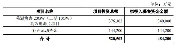 2024年11月16日,协鑫集成发布的向特定对象发行股票募集说明书(更新2024年三季度财务数据)显示,公司本次向特定对象发行募集资金总额预计为不超过484,200.00万元(含本数),扣除发行费用后的募集资金净额将全部用于以下项目:芜湖协鑫20GW(二期10GW)高效电池片项目、补充流动资金。