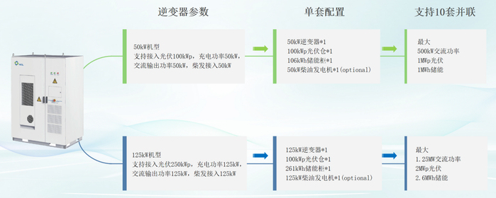储能适配方面,EcoPower Mate提供50kW和125kW两种机型选择,支持多套并联扩展。单套系统最大可支持1MWp光伏与1MWh 储能配置,多套并联后可实现 2MWp 光伏、2.6MWh 储能与 1.25MW 交流功率的大规模部署,满足不同规模的能源需求。