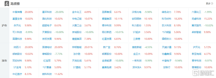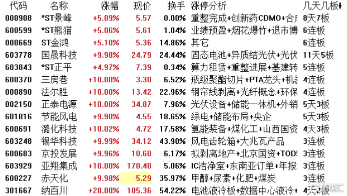 高位股方面,*ST景峰8天7板,*ST熊猫、ST金鸿6连板,国晟科技11天5板,*ST正平5连板,三房巷、法尔胜4连板。