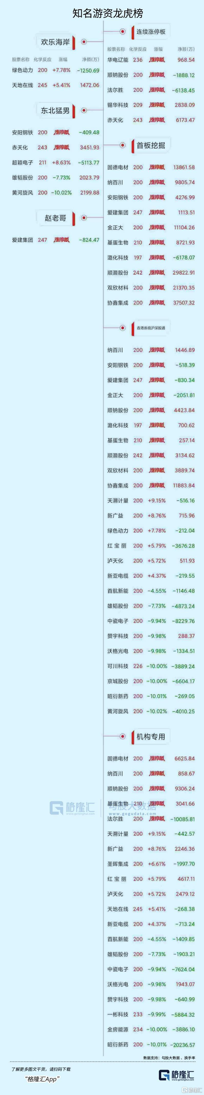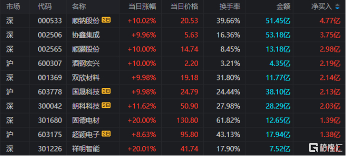 龙虎榜单日净买入额前三为协鑫集成、顺灏股份、酒钢宏兴,分别为3.75亿元、2.98亿元、2.19亿元。
