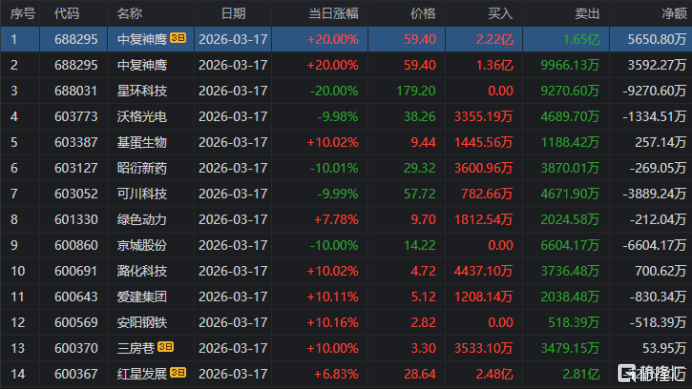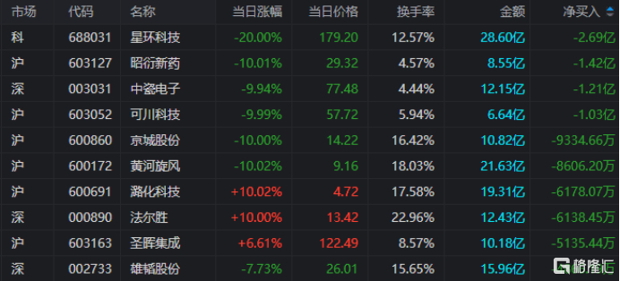 龙虎榜单日净卖出额前三为星环科技、昭衍新药、中瓷电子,分别为2.69亿元、1.42亿元、1.21亿元。