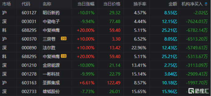 龙虎榜中涉及机构专用席位的个股中,当日净卖出额前三为昭衍新药、中瓷电子、中复神鹰,分别为2.02亿元、7624.03万元、6782.14万元。