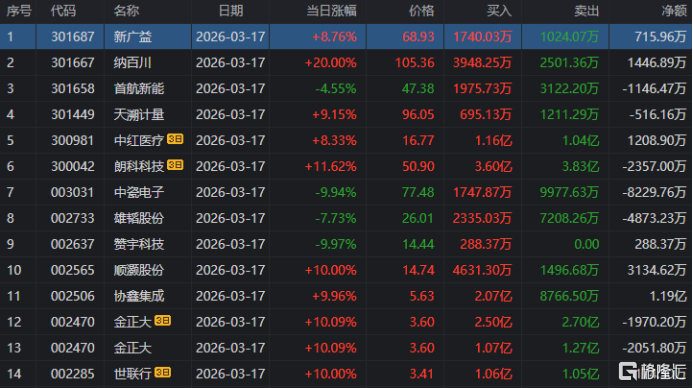 龙虎榜中涉及机构专用席位的个股中,当日净买入额前三为星环科技、祥明智能、顺钠股份,分别为1.19亿元、7718.96万元、6892.39万元。