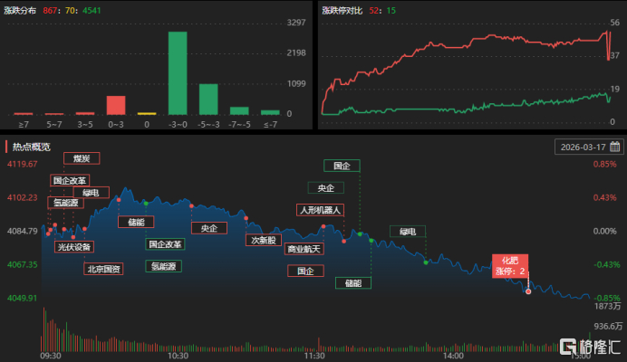 3月17日,A股三大指数高开低走,尾盘集体下挫,全市场成交额2.22万亿元,较前一交易日缩量1153亿元。板块方面,CPO概念、培育钻石、激光设备等板块下挫;保险、化纤、房地产等板块走高。