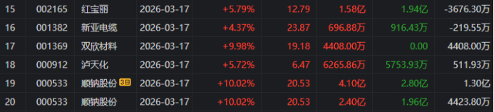 顺钠股份:今日涨停,全天换手率39.66%,成交额51.45亿元。机构净买入6892.39万元,深股通净买入4423.84万元,营业部席位合计净卖出1.32亿元。