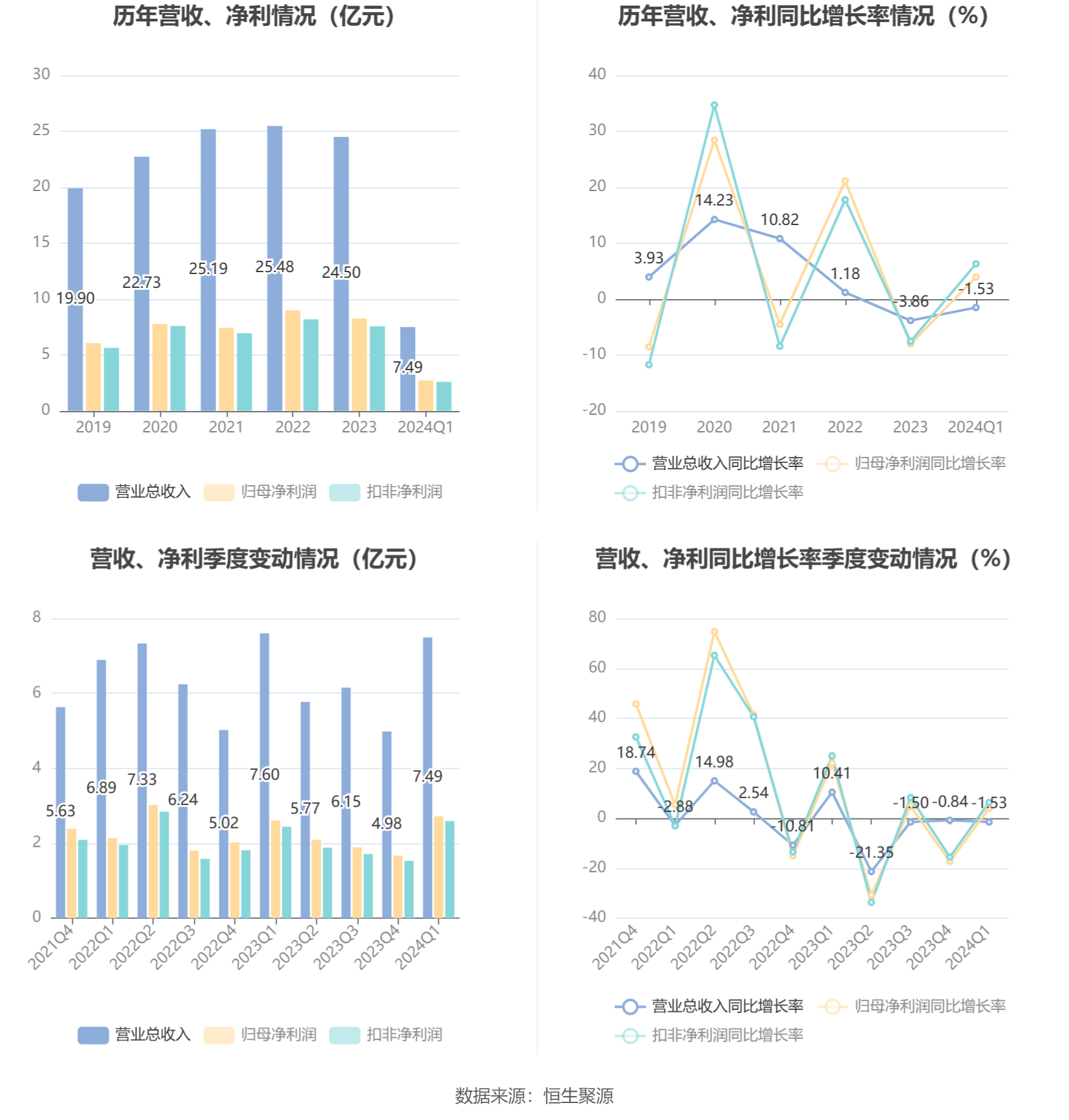 2024年第一季度,公司毛利率为52.11%,同比下降4.17个百分点;净利率为36.29%,较上年同期上升1.91个百分点。