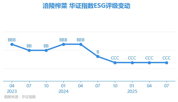 日前,华证指数公布了新一期(2025年7月31日)的ESG评级结果,涪陵榨菜(002507.SZ)获得CCC评级(华证指数评级为C起至AAA九档,C为最低档,AAA为其最高一级评级/AA为其第二档),上一期(2025年4月30日)ESG评级为CCC。本期ESG评级在156家食品行业A股上市公司中排名第76(上一期排名第88)。