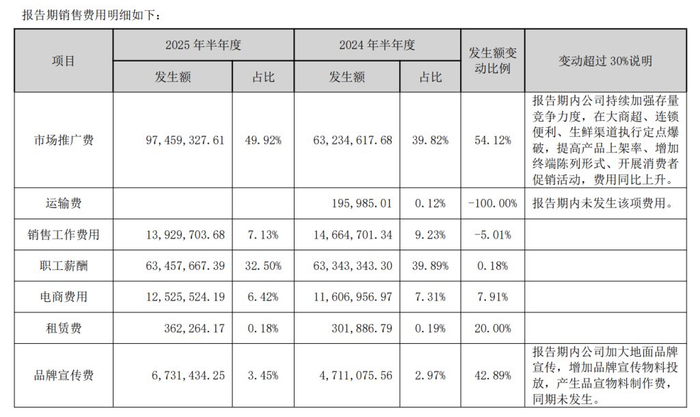 财务表现不佳的背后,是销售费用的激增。2025年上半年,涪陵榨菜销售费用高达1.95亿元,同比增长22.94%,增速远超营收。这些费用主要投放在大型商超、连锁便利店及生鲜渠道的精准营销策略,旨在提升产品上架率、优化终端陈列以及开展消费者促销活动。