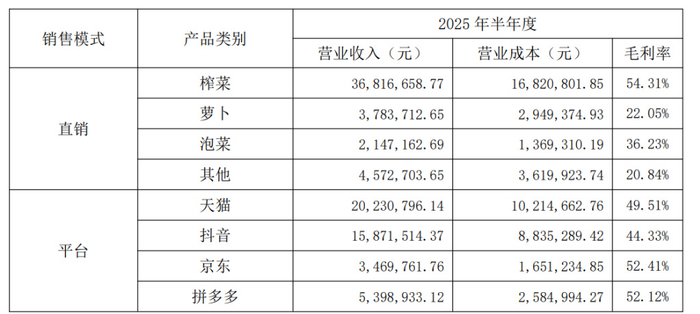 更令人担忧的是,新产品的盈利能力远不及传统榨菜。2025年上半年,公司榨菜产品毛利率为58.08%,萝卜、泡菜、其他产品毛利率分别为22.35%、32.29%、33.28%,均明显低于榨菜的毛利率。管理层解释,主要是新品推广前期以扩大体量为主,因此保持了较低的毛利率。
