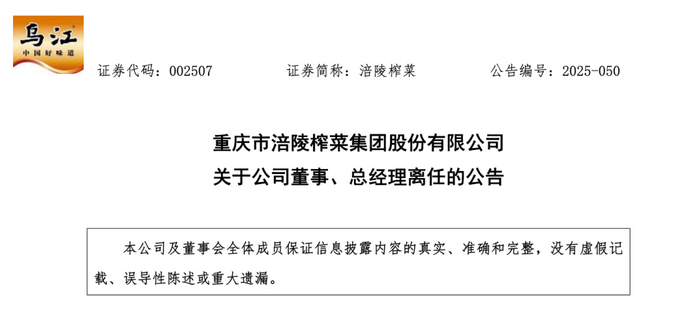 近日,涪陵榨菜发布的公告显示,董事、总经理赵平因工作调整,申请不再担任公司董事、总经理职务,董事会聘任高翔为公司总经理。这位在涪陵榨菜服务近30年、执掌总经理职务15年,见证了公司从崛起至巅峰的全过程的元老离任,引发市场广泛关注。