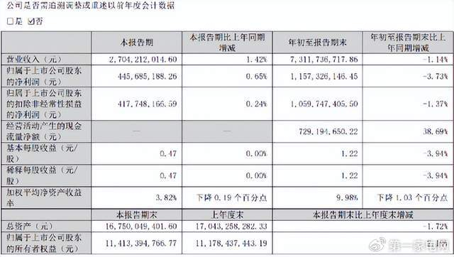 第三季度,老板电器营业收入27.04亿元,同比增长1.42%;归属于上市公司股东的净利润4.46亿元,同比增长0.65%。