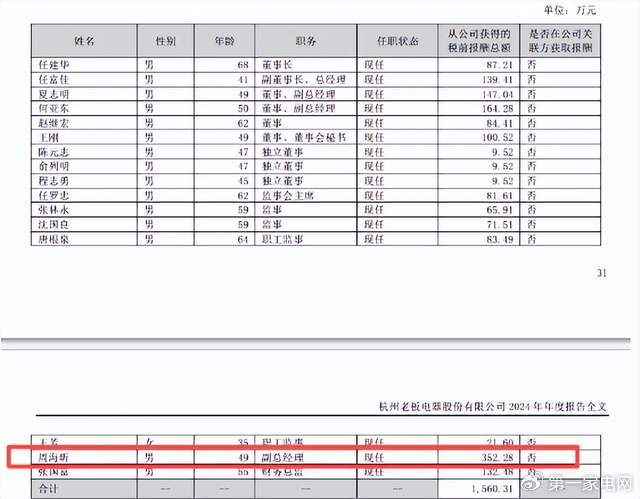 薪酬方面,老板电器副总经理周海昕于2024年从公司获得的税前报酬总额为352.28万元,居董监高薪酬之首。