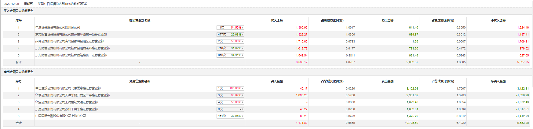 12月8日,天汽模今日跌7.98%,全天换手率达31.67%,振幅达18.68%。龙虎榜数据显示,营业部席位合计净卖出3926.04万元。其中,中信建投证券北京常惠路证券营业部、华泰证券天津东丽开发区二纬路证券营业部分别卖出3162.98万元、2331.52万元;申港证券四川分公司、东方财富证券拉萨东环路第一证券营业部分别买入1865.92万元、1822.27万元。