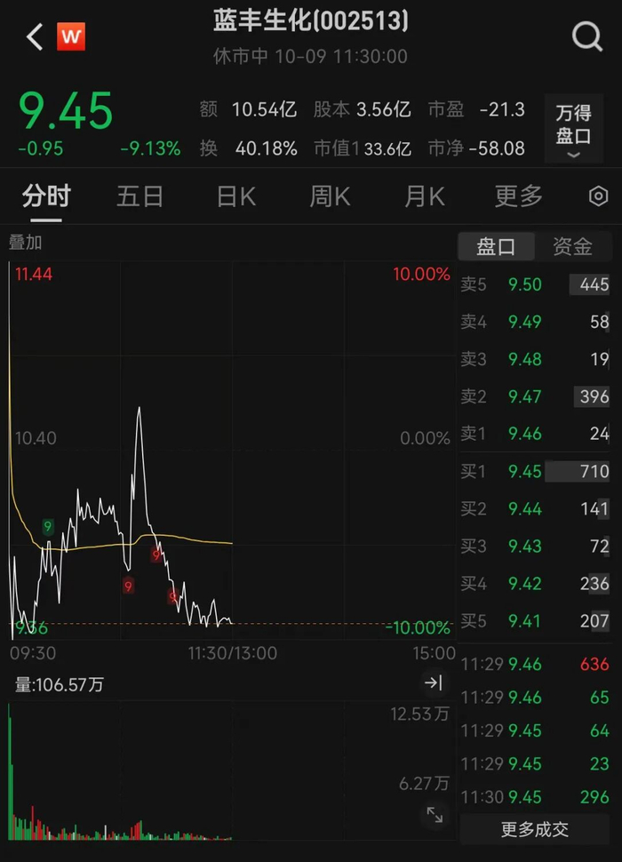 连板股方面,此前已连续7个交易日涨停的蓝丰生化(002513)继续以涨停价开盘。然而,开盘不到一分钟,数笔万手级别的大额抛单将股价砸向跌停,上演“天地板”,随后进入宽幅震荡走势。截至午间收盘,该股跌幅为9.13%。华建集团“4进5”失败,此前斩获“三连板”的天际股份则在涨停位反复打开。