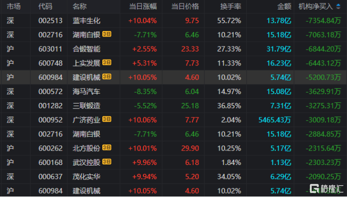 龙虎榜中涉及机构专用席位的个股中,当日净卖出额前三为蓝丰生化、合锻智能、海马汽车,分别为7354.84万元、6844.2万元、3629.91万元。