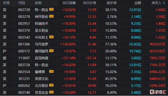 龙虎榜单日净买入额前三为科瑞技术、亚太药业、马可波罗,分别为1.4亿元、1.27亿元、9020.05万元。