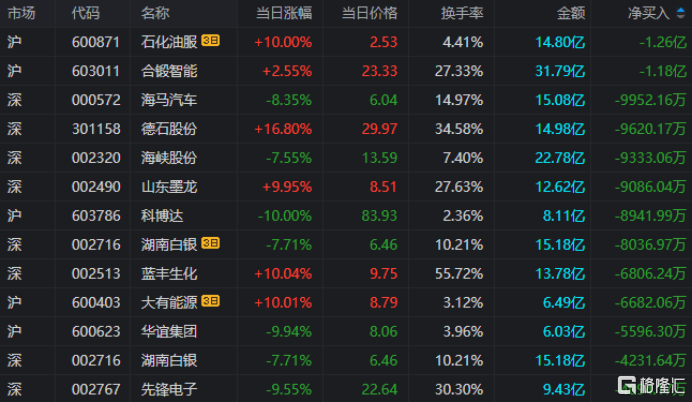 龙虎榜单日净卖出额前三为合锻智能、海马汽车、德石股份,分别为1.18亿元、9952.16元、9620.17万元。