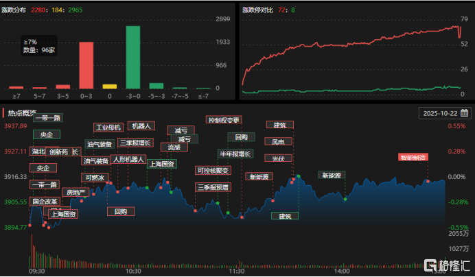 10月22日,沪深两市成交额1.67万亿,较上一个交易日缩量2248亿。板块方面,深地经济概念、人造肉、风电设备、房地产等板块涨幅居前,而贵金属、电池等板块下挫。
