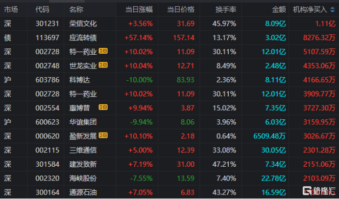 龙虎榜中涉及机构专用席位的个股中,当日净买入额前三为荣信文化、科博达、特一药业,分别为1.11亿元、4166.65万元、3909.77万元。