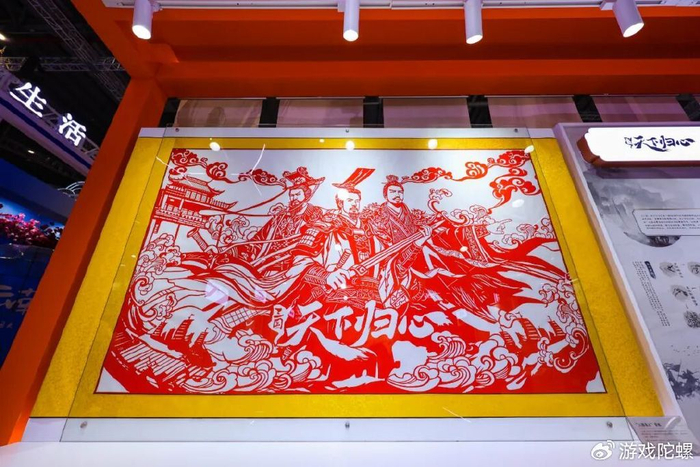 比如《蓝月传奇》和侗族木构营造技艺大师合作的,由2.8W零件组成的“龙城沙巴克”建筑模型就是首次对外展出。《三国:天下归心》和扬州剪纸国家级非遗大师合作的宽2米的“三国鼎立”剪纸作品也是首次曝光。