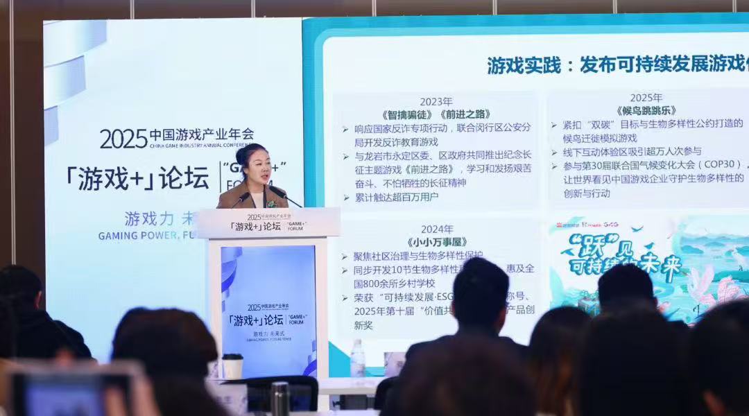 12月19日,由中国音像与数字出版协会指导,中国音像与数字出版协会游戏工委、中国音像与数字出版协会游戏产业研究专委会主办,金报电子音像出版(北京)有限公司、人民灵境研究院、灵境·人民游戏实验室支持的“2025游戏公益盛典”在上海举办。恺英网络首席可持续发展官付丽娜围绕“恺心百工灵-以IP之力,驱动非遗活化传承”主题,分享了恺英网络以游戏IP为纽带,创新非遗传承模式的实践经验。