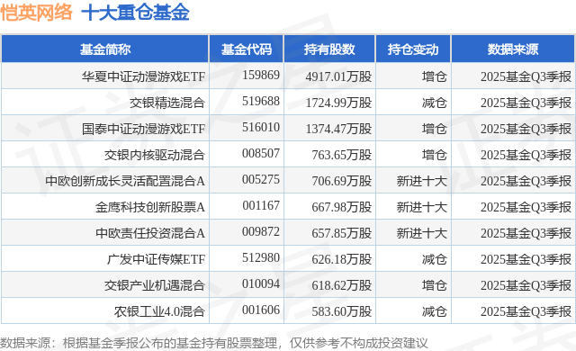 根据2025基金Q3季报公募基金重仓股数据,重仓该股的公募基金共297家,其中持有数量最多的公募基金为华夏基金的华夏中证动漫游戏ETF。华夏中证动漫游戏ETF目前规模为106.97亿元,最新净值1.4385(12月31日),较上一交易日上涨0.24%,近一年上涨43.55%。该公募基金现任基金经理为鲁亚运。鲁亚运在任的基金产品包括:华夏创业板成长ETF联接A,管理时间为2022年6月10日至今,期间收益率为4.15%;华夏中证全指证券公司ETF联接A,管理时间为2022年6月10日至今,期间收益率为30.51%;华夏国证疫苗与生物科技指数发起A,管理时间为2022年9月6日至今,期间收益率为-34.72%;华夏战略新兴成指ETF联接A,管理时间为2023年3月27日至今,期间收益率为32.12%。