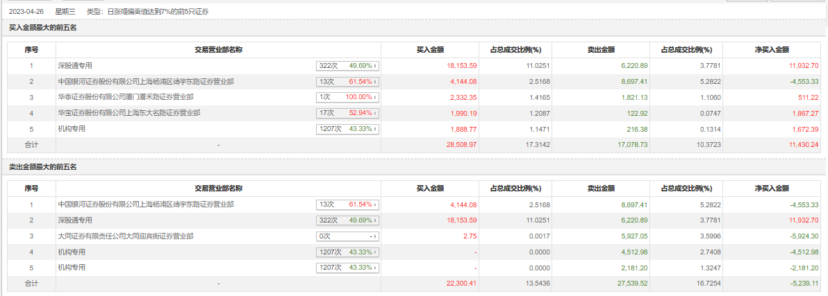 具体来看,机构买入1888.77万元,卖出6910.56万元,合计净卖出5021.79万元。此外,深股通专用、中国银河证券上海杨浦区靖宇东路证券营业部分别买入1.82亿元、4144.08万元;中国银河证券上海杨浦区靖宇东路证券营业部、深股通专用分别卖出8697.41万元、6220.89万元。