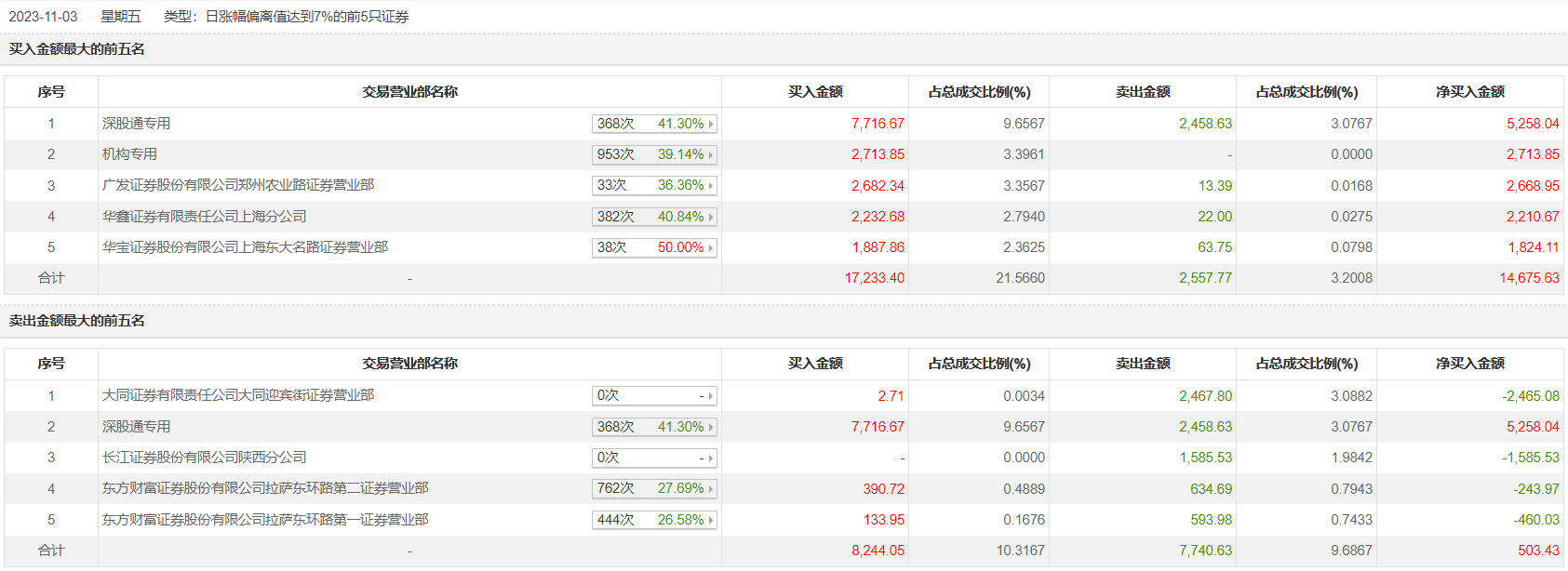 科士达11月3日涨停,全天换手率达5.29%,振幅达9.87%。龙虎榜数据显示,营业部席位合计净买入9921.01万元。其中,机构合计净买入2713.85万元。此外,深股通专用、广发证券郑州农业路证券营业部分别买入7716.67万元、2682.34万元;大同证券大同迎宾街证券营业部、深股通专用分别卖出2467.80万元、2458.63万元。