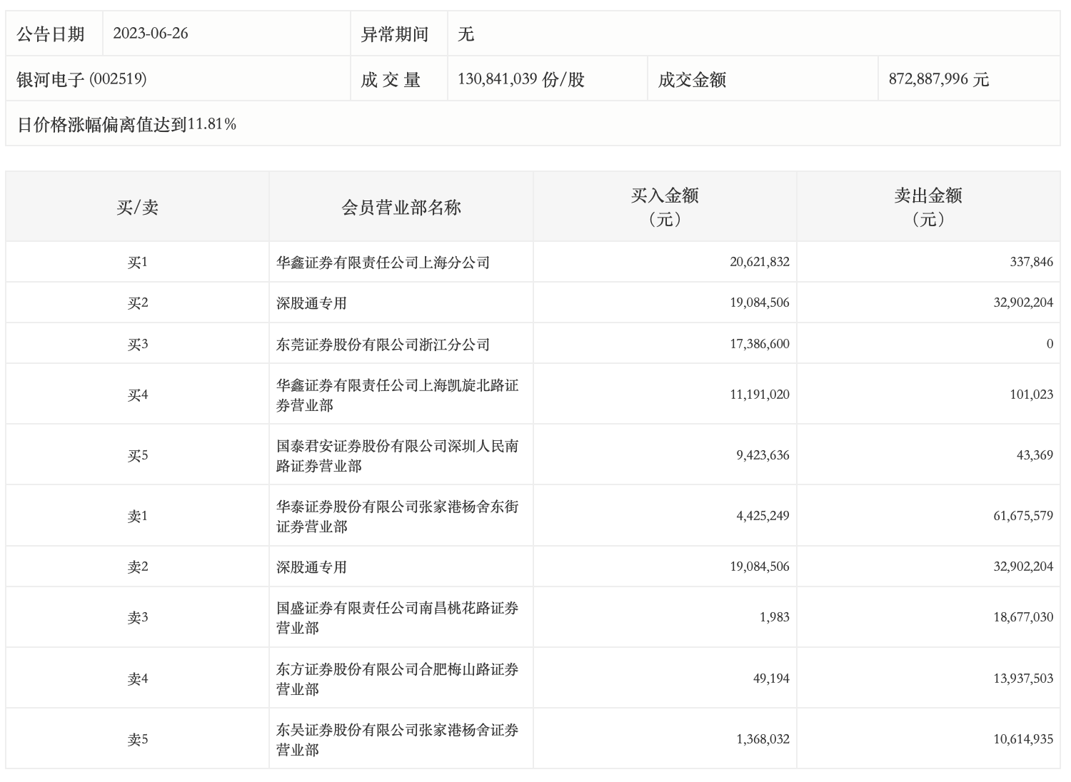 6月26日,银河电子今日涨停,龙虎榜数据显示,上榜营业部席位全天成交2.22亿元,占当日总成交金额比例为25.41%。其中,买入金额为8355.21万元,卖出金额为1.38亿元,合计净卖出5473.74万元。