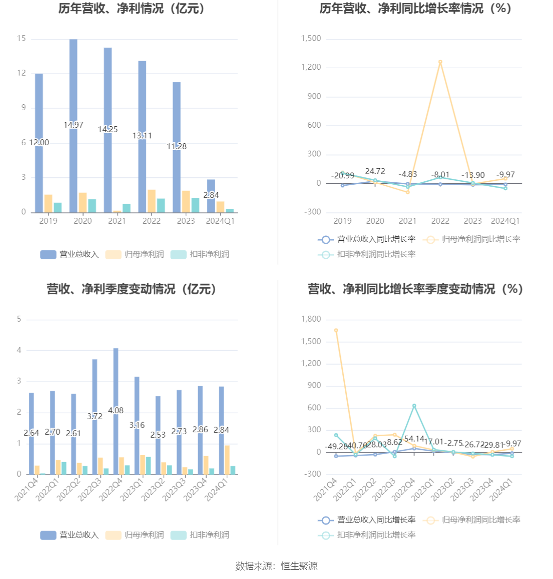 2024年第一季度,公司毛利率为35.65%,同比下降10.20个百分点;净利率为32.80%,较上年同期上升13.05个百分点。