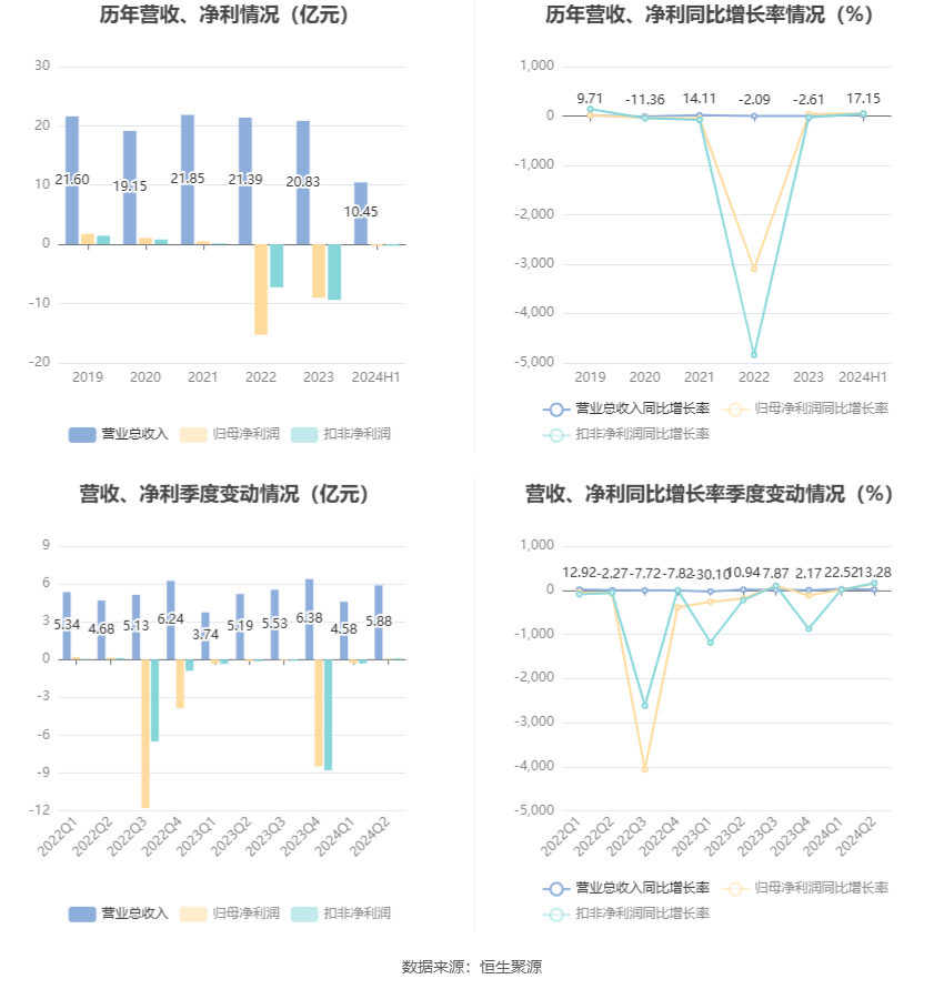 数据显示,2024年上半年公司加权平均净资产收益率为-1.88%,较上年同期增长0.27个百分点;公司2024年上半年投入资本回报率为-3.90%,较上年同期下降3.83个百分点。