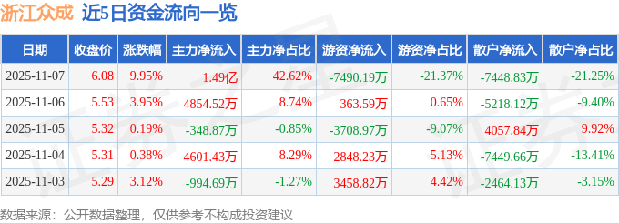 证券之星消息,浙江众成11月7日涨停收盘,收盘价6.08元。该股于9点31分涨停,1次打开涨停,截止收盘封单资金为5091.6万元,占其流通市值0.93%。