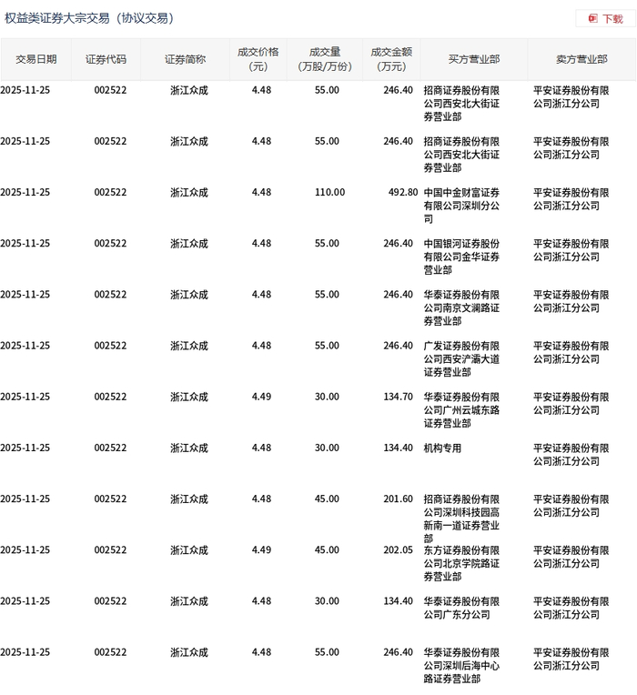 11月25日,浙江众成大宗交易成交620万股,成交额2778.35万元,占当日总成交额的18.49%,成交均价4.48元,较市场收盘价5.06元折价11.44%,其中最高成交价4.49元,最低成交价4.48元。