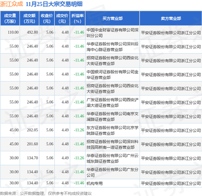 11月25日浙江众成现10笔折价11.46%的大宗交易 合计成交2778.35万元