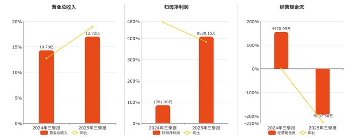 公司营业总收入为12.72亿元,在已披露的同业公司中排名第32,较去年同报告期营业总收入增加2.02亿元,实现2年连续上涨,同比较去年同期上涨18.92%。归母净利润为8520.15万元,在已披露的同业公司中排名第37,较去年同报告期归母净利润增加6758.25万元,实现2年连续上涨,同比较去年同期上涨383.58%。经营活动现金净流入为-5637.68万元。