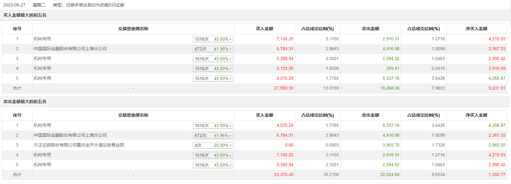 具体来看,机构买入2.07亿元,卖出1.39亿元,合计净买入6864.58万元。此外,中国国际金融上海分公司、方正证券重庆金开大道证券营业部分别卖出4416.98万元、3965.70万元;中国国际金融上海分公司、方正证券重庆金开大道证券营业部分别买入6784.31万元、6555元。
