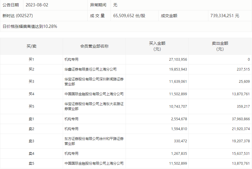 8月2日,新时达今日涨停,龙虎榜数据显示,上榜营业部席位全天成交1.96亿元,占当日总成交金额比例为26.48%。其中,买入金额为8659.14万元,卖出金额为1.09亿元,合计净卖出2262.79万元。