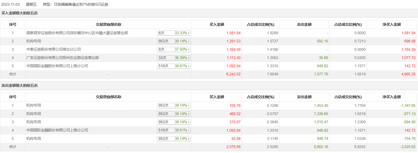 新时达11月3日涨停,全天换手率达14.38%,振幅达5.63%。龙虎榜数据显示,营业部席位合计净买入996.92万元。其中,机构买入2274.96万元,卖出5244.42万元,合计净卖出2969.46万元。此外,国泰君安证券深圳福田中心区华融大厦证券营业部、中泰证券湖北分公司分别买入1581.84万元、1164.09万元;中国国际金融上海分公司、广发证券郑州农业路证券营业部分别卖出949.92万元、35.69万元。