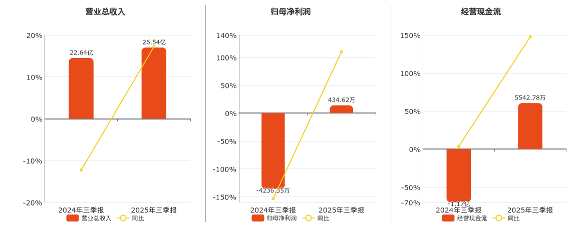 公司营业总收入为26.54亿元。归母净利润为434.62万元,在已披露的同业公司中排名第95。经营活动现金净流入为5542.78万元。