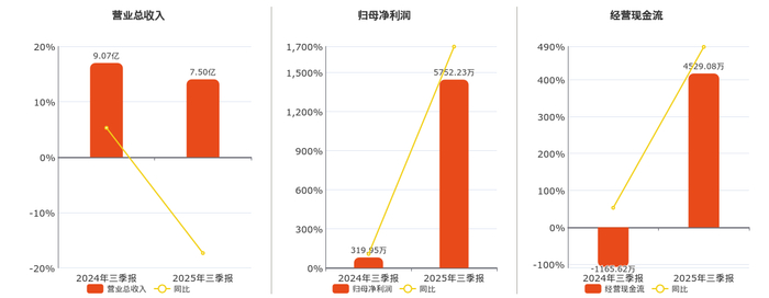 公司营业总收入为7.50亿元,较去年同报告期营业总收入减少1.57亿元,同比较去年同期下降17.32%。归母净利润为5752.23万元。经营活动现金净流入为4529.08万元。
