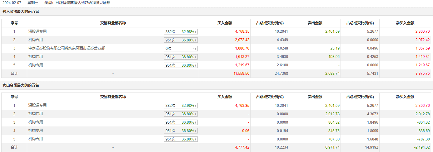 天顺风能2月7日涨停,全天换手率达2.68%,振幅达8.58%。龙虎榜数据显示,营业部席位合计净买入4374.67万元。其中,机构买入4919.43万元,卖出4709.11万元,合计净买入210.31万元。此外,深股通专用、中泰证券潍坊东风西街证券营业部分别买入4768.35万元、1880.78万元;深股通专用、中泰证券潍坊东风西街证券营业部分别卖出2461.59万元、23.19万元。