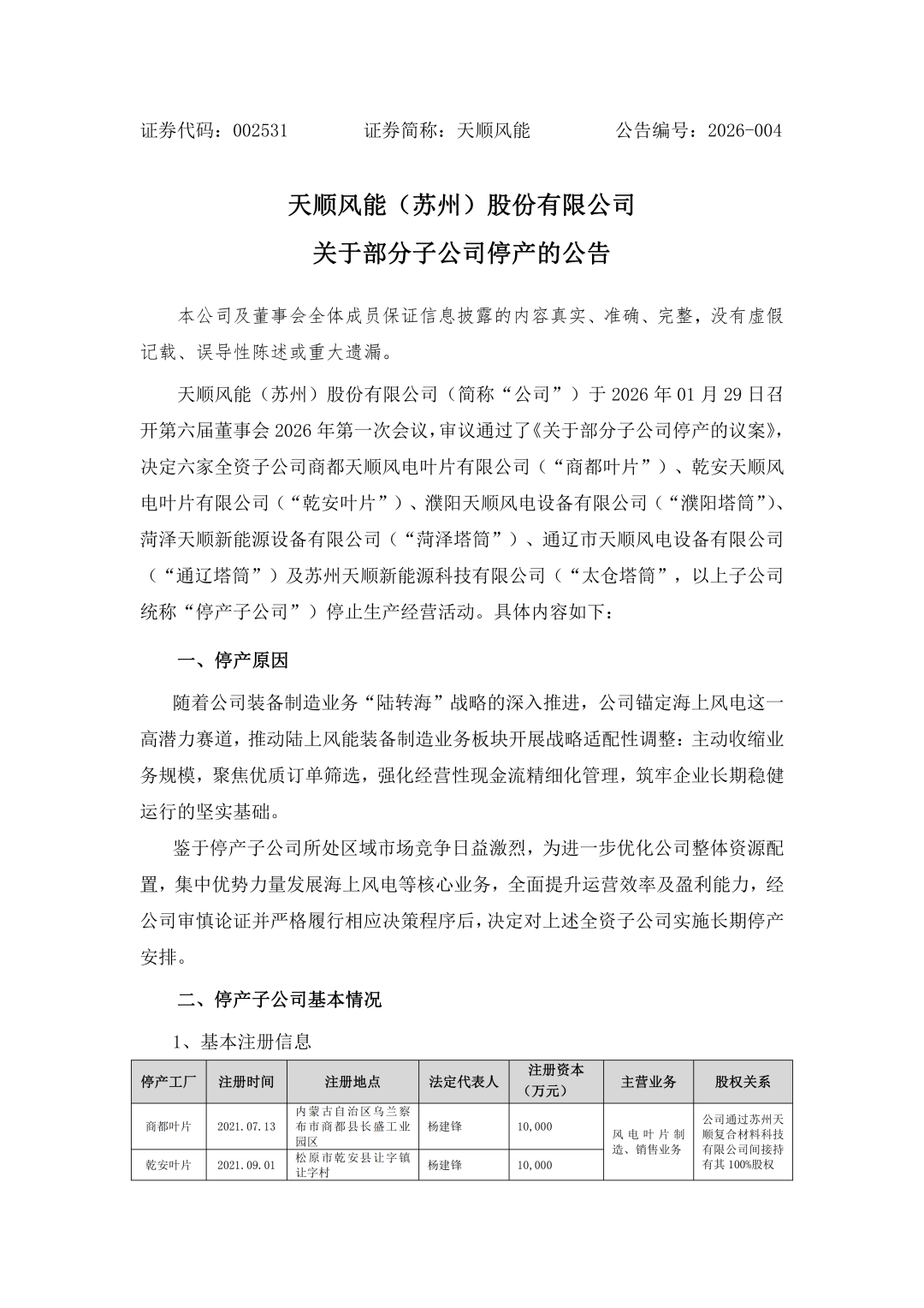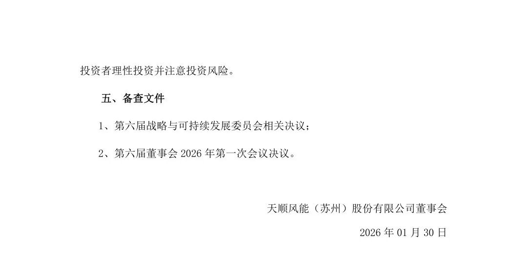 公告指出,天顺风能于2026年1月29日召开第六届董事会2026年第一次会议,审议通过了《关于部分子公司停产的议案》,决定六家全资子公司商都天顺风电叶片有限公司、乾安天顺风电叶片有限公司、濮阳天顺风电设备有限公司、菏泽天顺新能源设备有限公司、通辽市天顺风电设备有限公司及苏州天顺新能源科技有限公司停止生产经营活动。