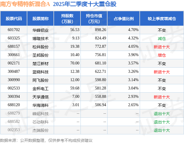 根据2025基金半年报公募基金重仓股数据,重仓该股的公募基金共3家,其中持有数量最多的公募基金为南方基金的南方专精特新混合A。南方专精特新混合A目前规模为1.56亿元,最新净值1.0201(9月30日),较上一交易日上涨1.48%,近一年上涨44.57%。该公募基金现任基金经理为罗安安 雷嘉源。罗安安在任的基金产品包括:南方优选价值混合A,管理时间为2015年7月10日至今,期间收益率为131.94%;南方新兴龙头灵活配置混合,管理时间为2017年12月15日至今,期间收益率为118.65%;南方人工智能混合,管理时间为2018年10月12日至今,期间收益率为234.77%;南方核心成长混合A,管理时间为2020年7月16日至今,期间收益率为-9.36%。雷嘉源在任的基金产品包括:南方创新精选一年定开混合A,管理时间为2020年8月21日至今,期间收益率为4.78%;南方国策动力,管理时间为2021年6月4日至今,期间收益率为13.75%;南方北交所精选两年定开混合发起,管理时间为2021年11月23日至今,期间收益率为75.39%;