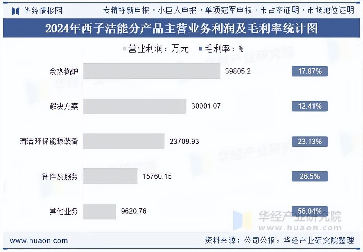 按产品分类来看,2024年西子洁能营业利润为118897.11万元,其中排名前三的产品分别为:余热锅炉、解决方案、清洁环保能源装备,利润分别为:39805.2万元、30001.07万元、23709.93万元,毛利率分别为:17.87%、12.41%、23.13%。