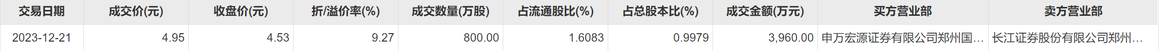 今日大宗交易成交800万股,成交额3960万元,占当日总成交额的43.92%,成交价4.95元,较市场收盘价溢价9.27%。