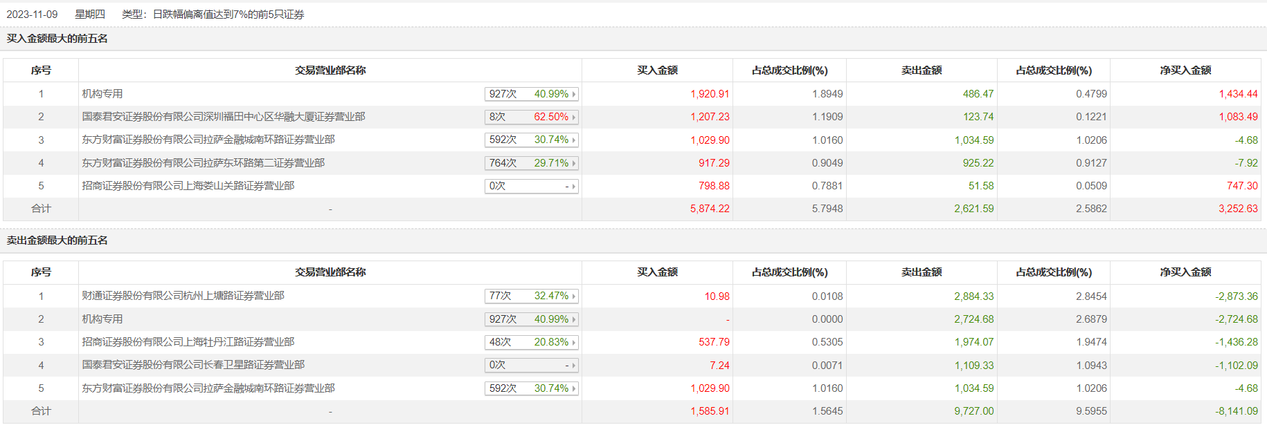 飞龙股份11月9日跌停,全天换手率达13.43%,振幅达8.12%。龙虎榜数据显示,营业部席位合计净卖出4883.78万元。其中,机构买入1920.91万元,卖出3211.15万元,合计净卖出1290.24万元。此外,财通证券杭州上塘路证券营业部、招商证券上海牡丹江路证券营业部分别卖出2884.33万元、1974.07万元;国泰君安证券深圳福田中心区华融大厦证券营业部、东方财富证券拉萨金融城南环路证券营业部分别买入1207.23万元、1029.90万元。