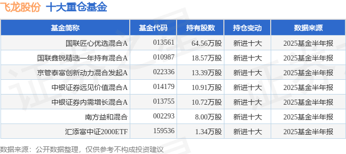 持有飞龙股份最多的基金为国联匠心优选混合A,目前规模为3.75亿元,最新净值1.0631(10月22日),较上一交易日下跌0.56%,近一年上涨36.8%。该基金现任基金经理为王喆 杜超。