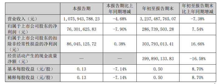 报告显示,飞龙股份公司前三季度营业收入为32.37亿元,同比下降7.38%;归母净利润为2.87亿元,同比增长7.54%;扣非归母净利润为3.04亿元,同比增长16.66%;基本每股收益0.50元。