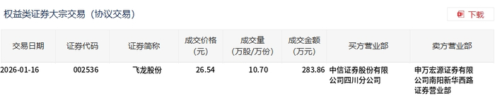 1月16日,飞龙股份大宗交易成交10.7万股,成交额283.86万元,占当日总成交额的0.19%,成交价26.54元,较市场收盘价29.75元折价10.79%。