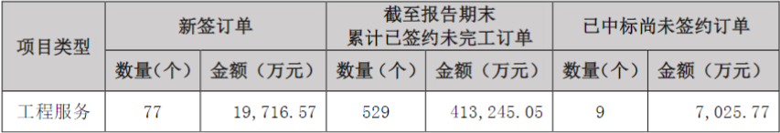 7月26日公告,第二季度工程服务项目新签订单77个,合计金额1.97亿元;截至报告期末累计已签约未完工订单529个,合计金额41.32亿元;已中标尚未签约订单9个,合计金额7025.77万元。